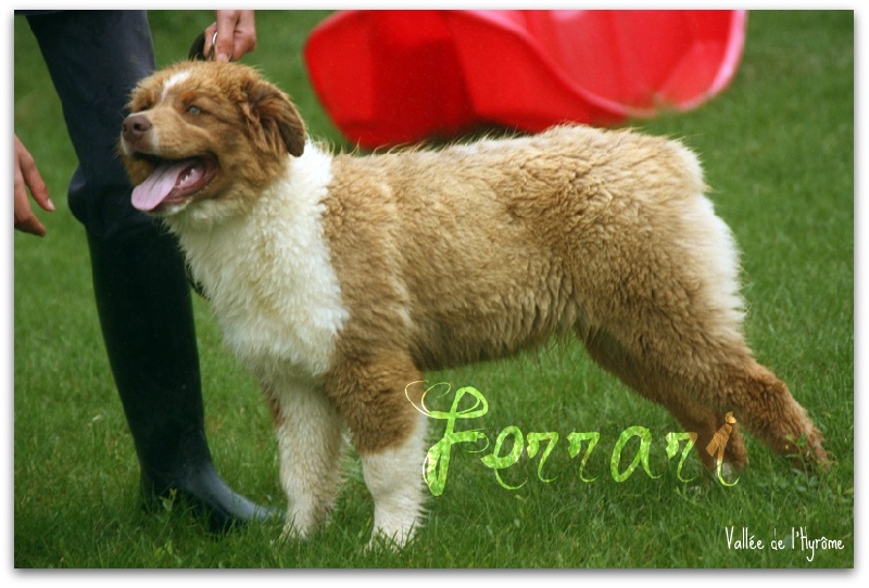 Rouge tri, queue écourtée, MDR1 +/- Très beau chiot avec du potentiel en expo. Grosse ossature, avec une bonne tête de mâle, bonnes angulations. Ferrari n'a peur de rien, sait marcher en laisse, il commence aussi à savoir se présenter.